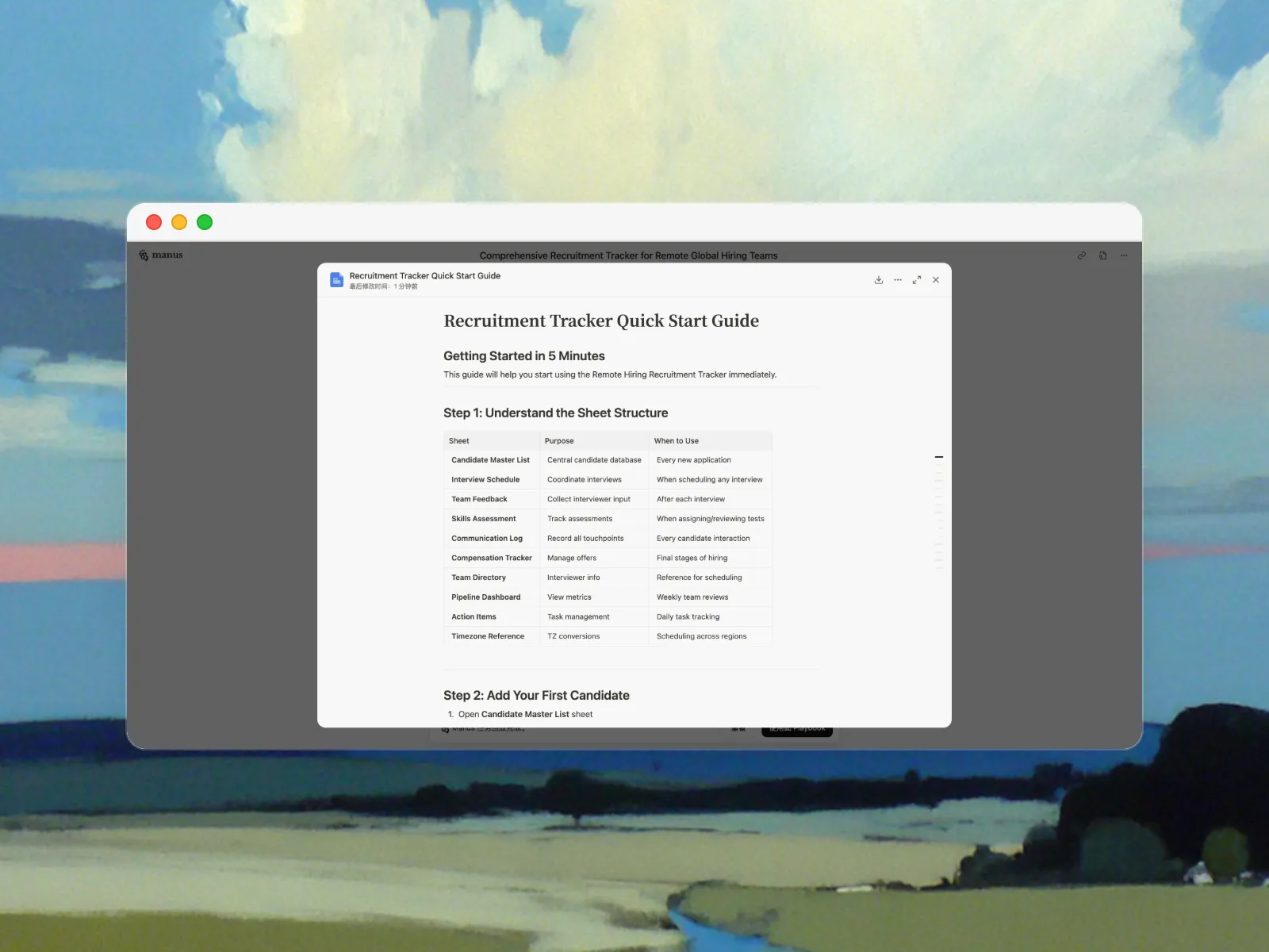 Start by defining your hiring stages, such as application review, phone screening, interviews, and offer. For each candidate, record their contact information, current stage, interview feedback, and any relevant notes. Update their status as they progress. With Manus, you can generate a complete tracking system that includes all these elements, customized to your specific hiring workflow.