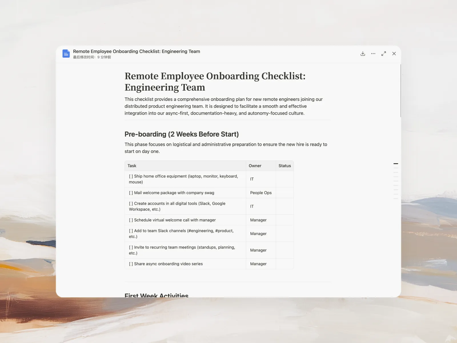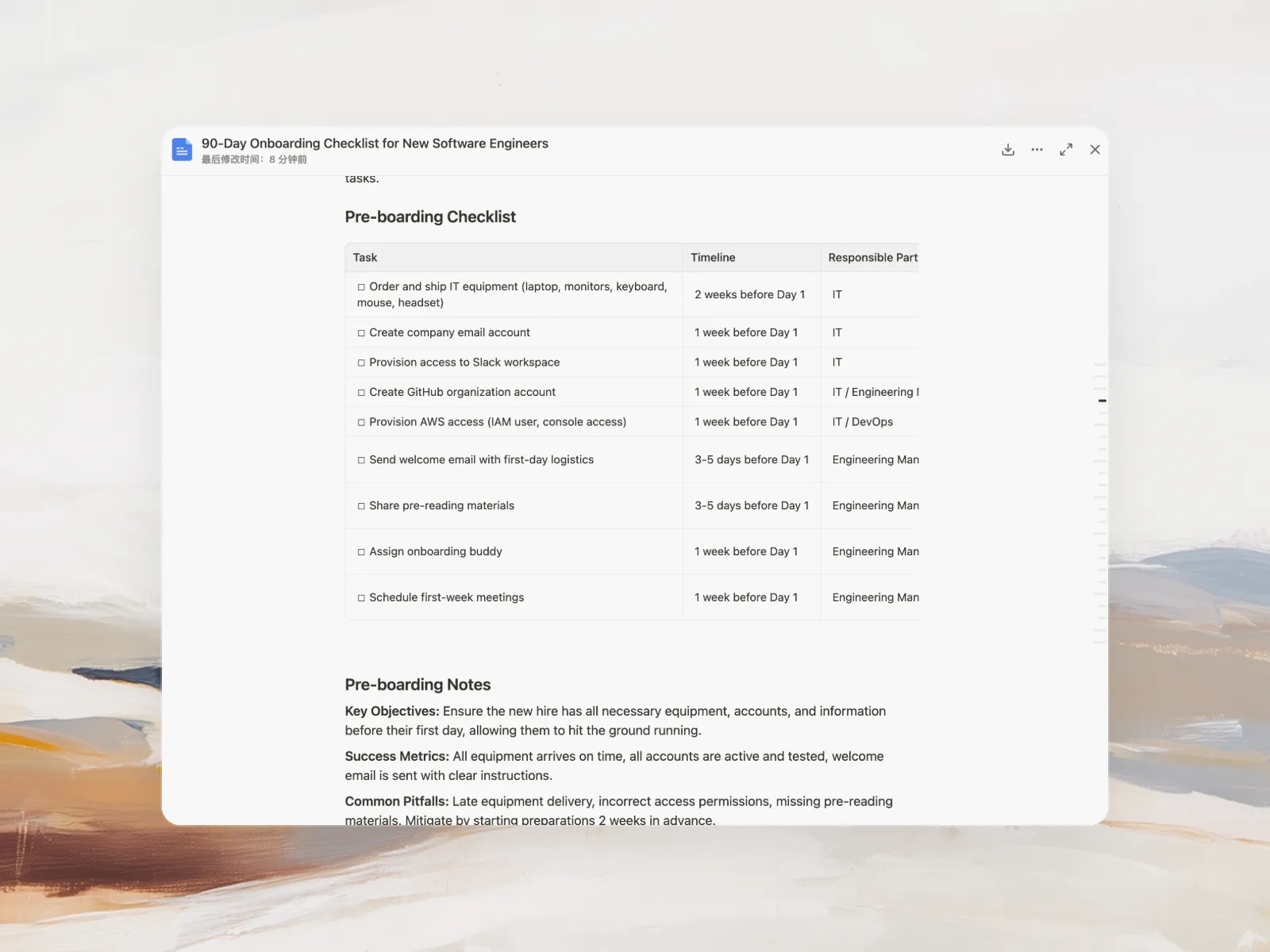 Absolutely. Refine any part through conversation—add company-specific tasks, adjust timelines, emphasize compliance or culture, or restructure phases. Manus iterates with you until the checklist perfectly matches your vision.
